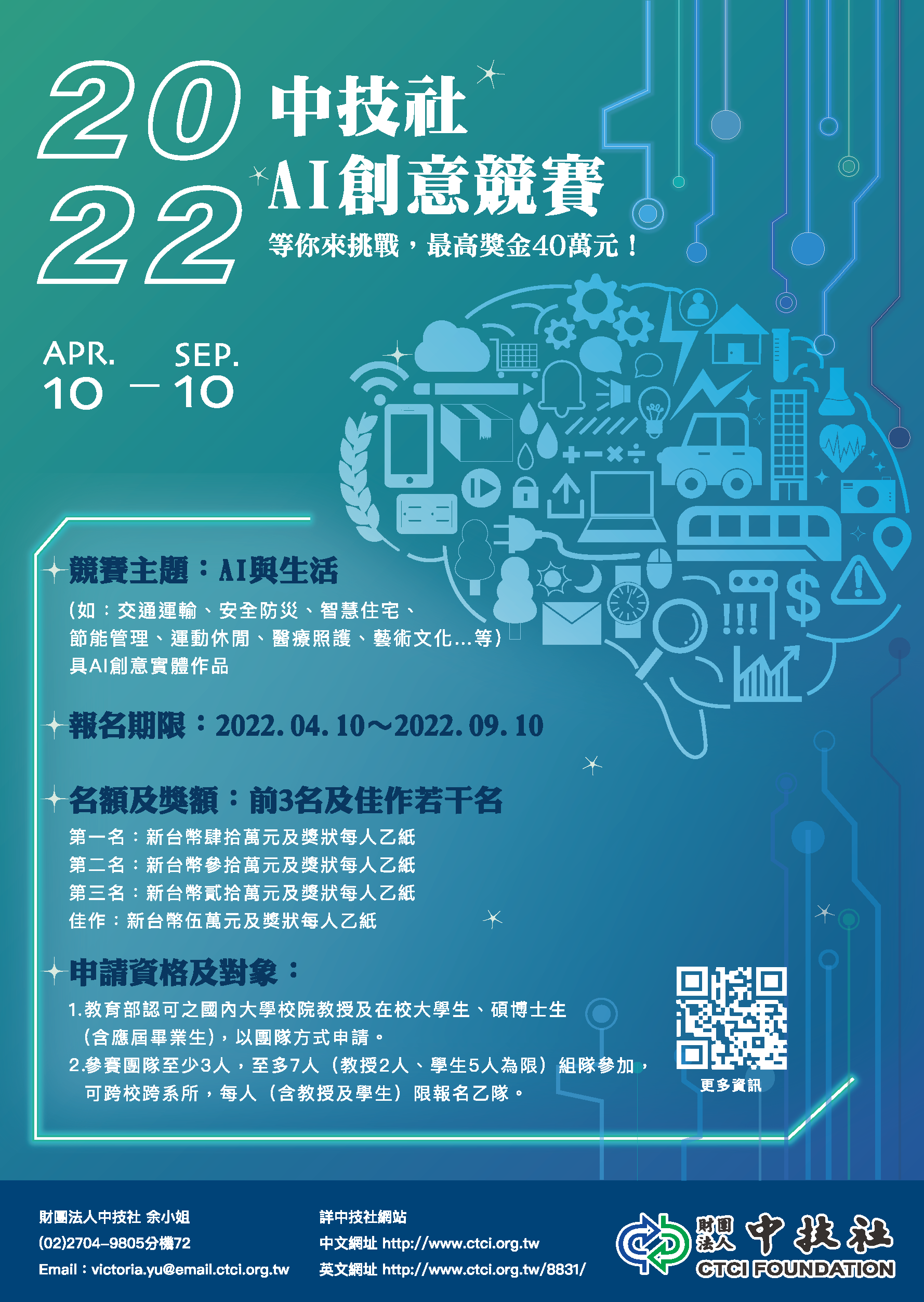 2022 中技社AI創意競賽 競賽主題:AI與生活 名額及獎額:前3名及佳作若干名 第一名:新台幣40萬元及獎 […]